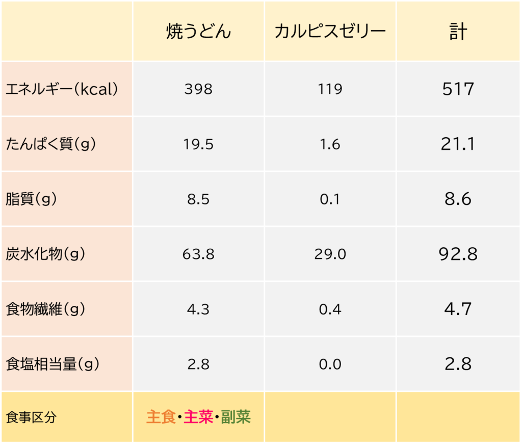 野菜とお肉がたっぷりで、低カロリーなのにとっても満足感のある焼うどんと、カルピスゼリーでした!!